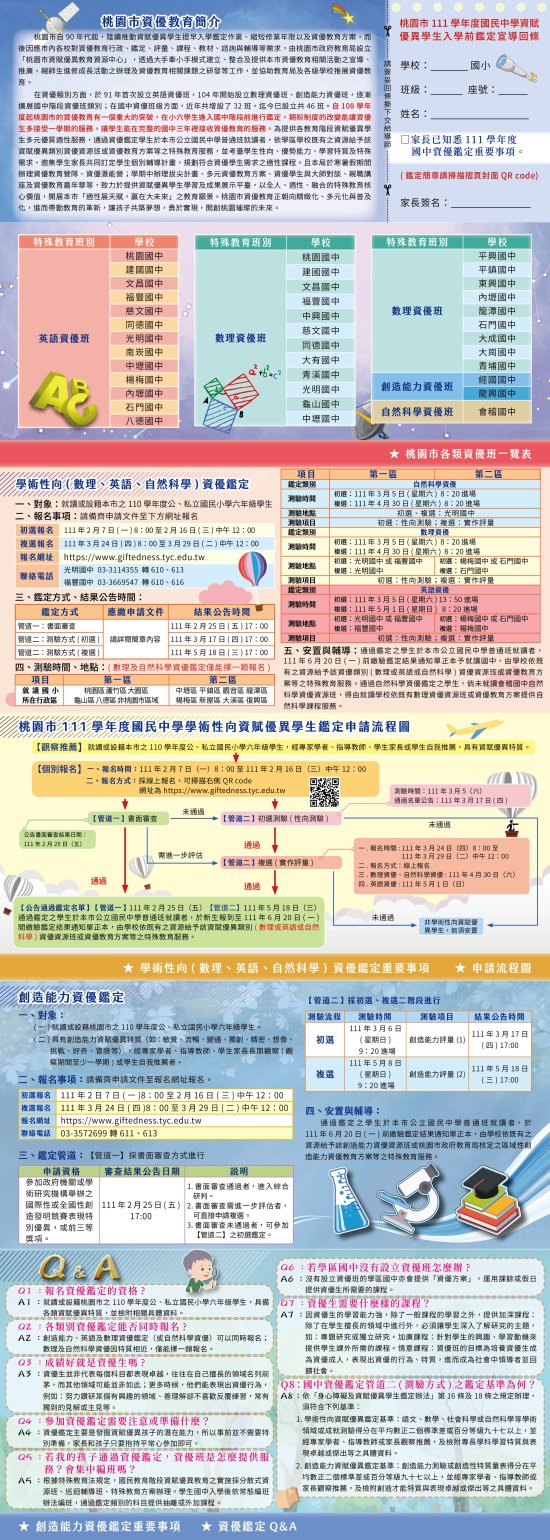 主旨:有關本市 111 學年度國民中學資賦優異學生鑑定宣導事宜,請依說明段辦理,並轉知親師生知悉,請查照。