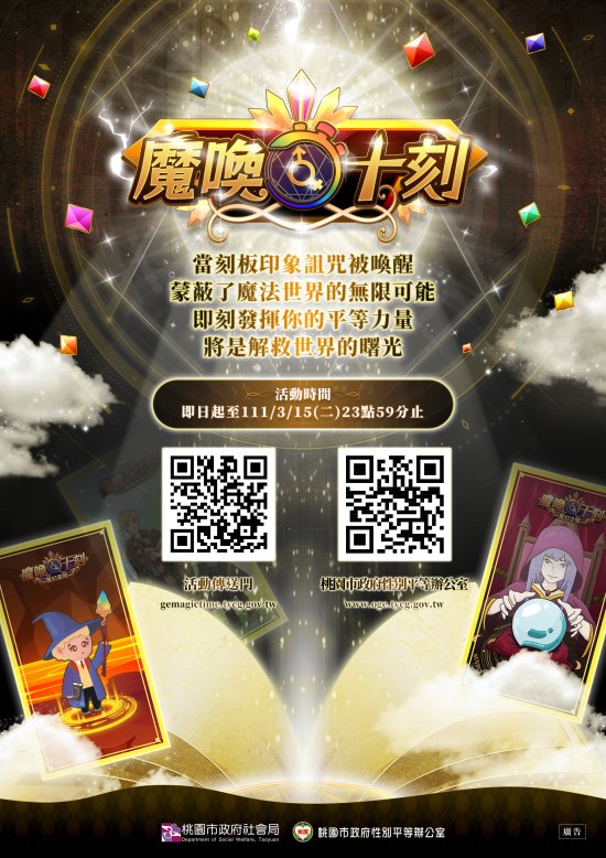 二、為使性別平等教育及宣導不因疫情而中斷,本府於 110 年以「去除性別刻板印象與偏見」為主題,特別建置性別平等專題式多媒體網站「魔喚十刻」(網址: https://gemagictime.tycg.gov.tw/),結合性平知識與互動遊戲,並邀請學校師生及社會大眾一起輕鬆認識性平。
